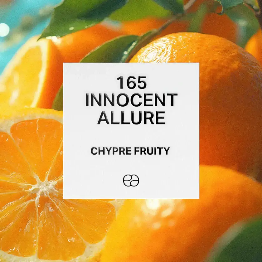 165 INNOCENT ALLURE is a sweet, feminine and flirtatious fragrance. Fruity chypre with a sweet praline note accompanied by juicy orange. A floral bouquet of white and violet flowers on a base of patchouli and musk.